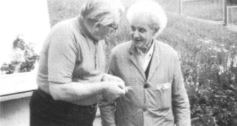 [Mr. Alfons Natterer, the originator of Nawa Water by simple osmosis and Dr. Albert. R. Riedel of the Paracelsus Laboratories. Inc. in U.S.A. in one of their many friendly discussions about the improved method of separation at Mr. Natterer’s place in upper Bavaria. Germany.]